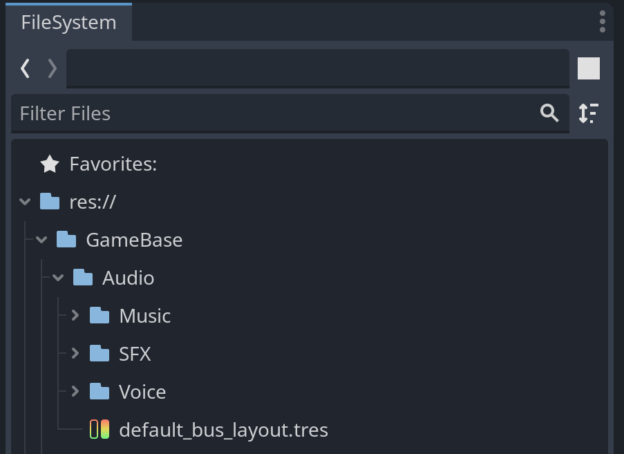 - The default_bus_layout is stored in the root of the Audio Folder. This file tells Godot how many busses your game has.